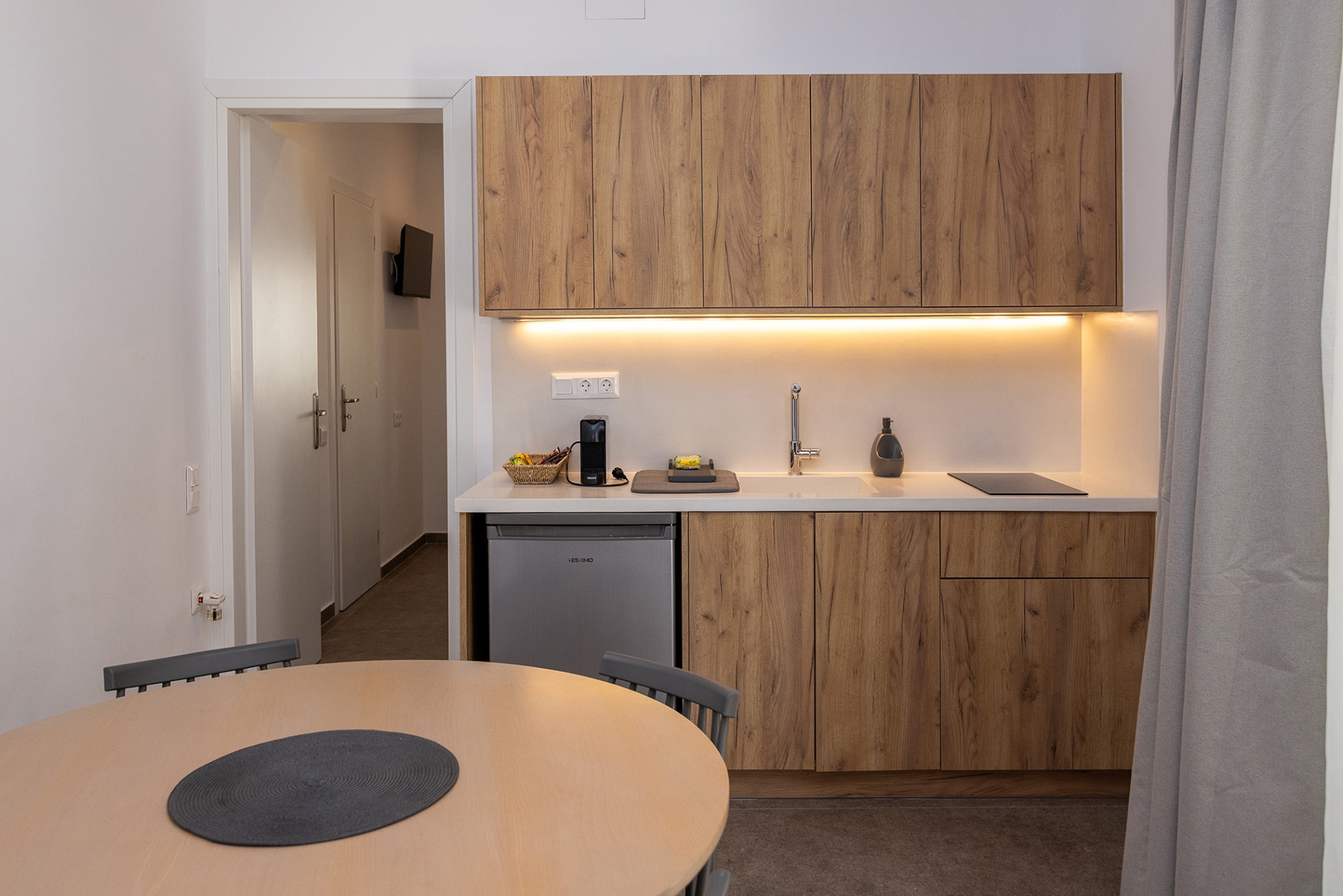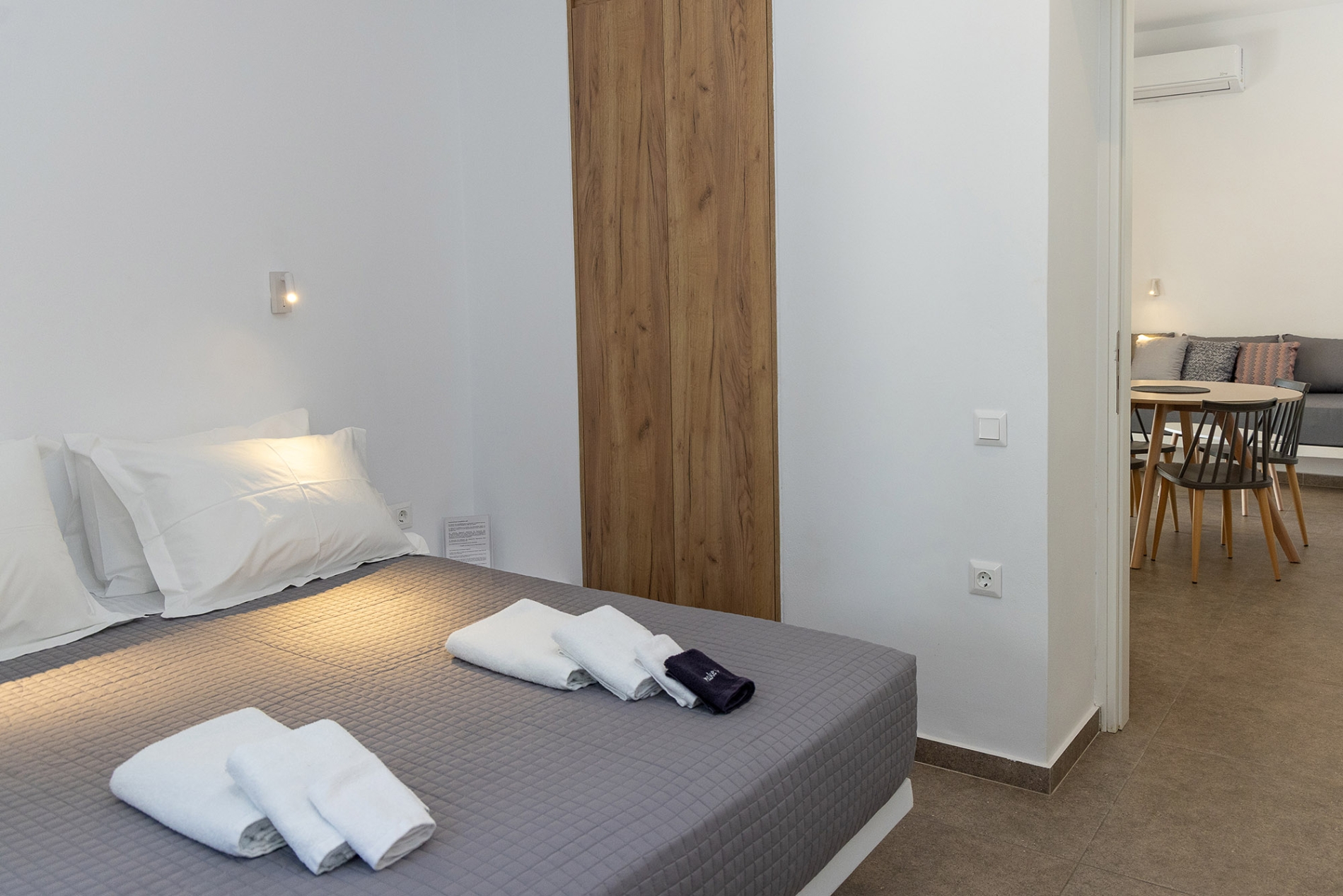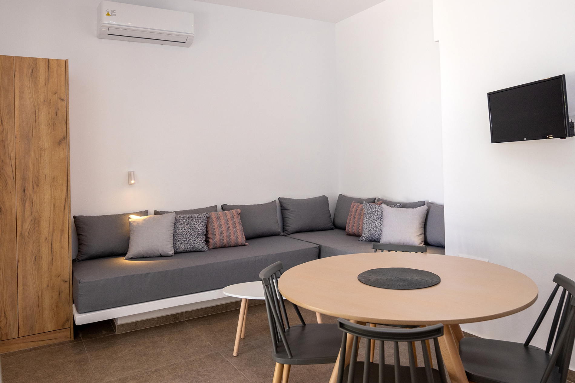 Kechros Deluxe Apartment blends timeless island architecture with modern comforts, creating a warm and inviting atmosphere.