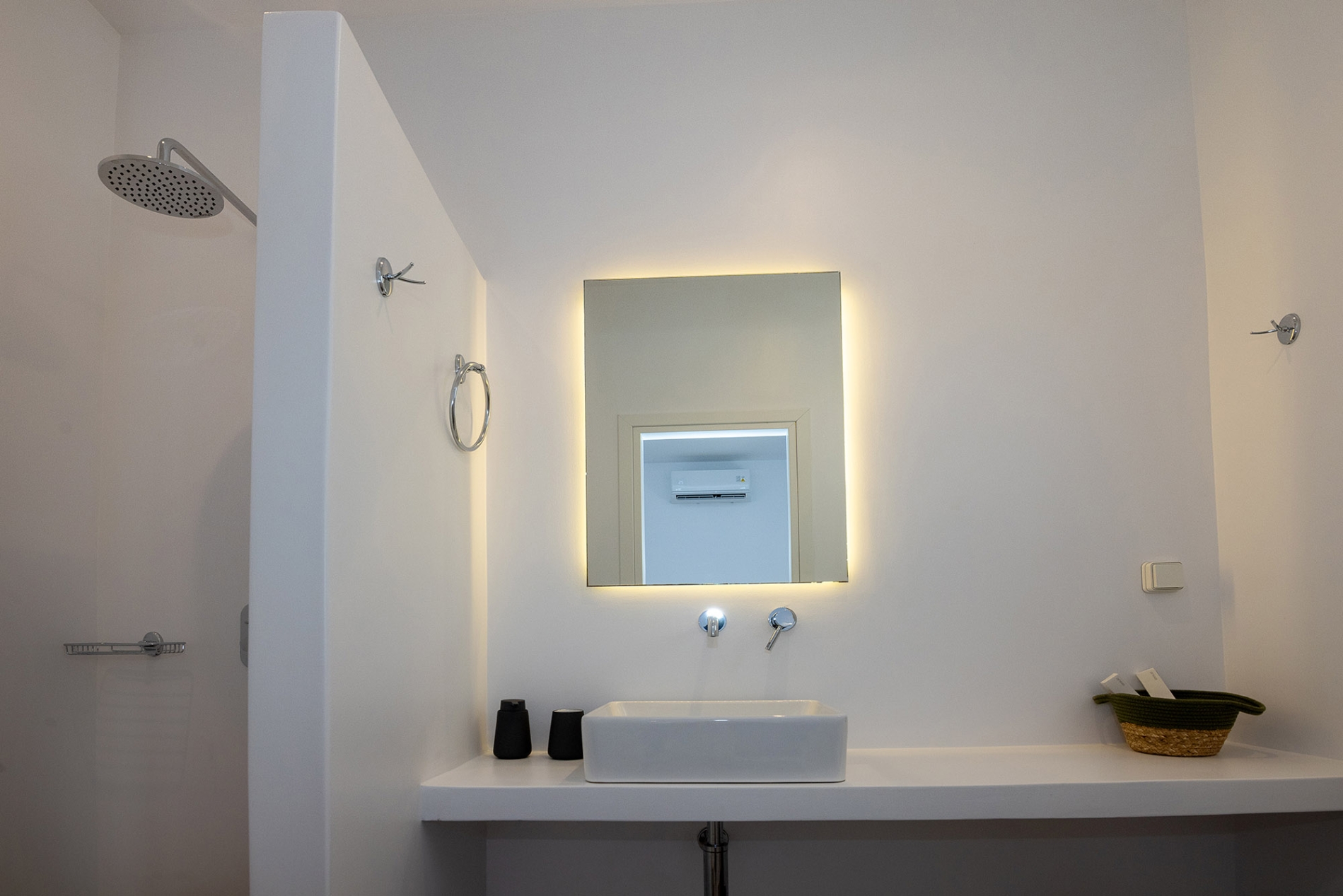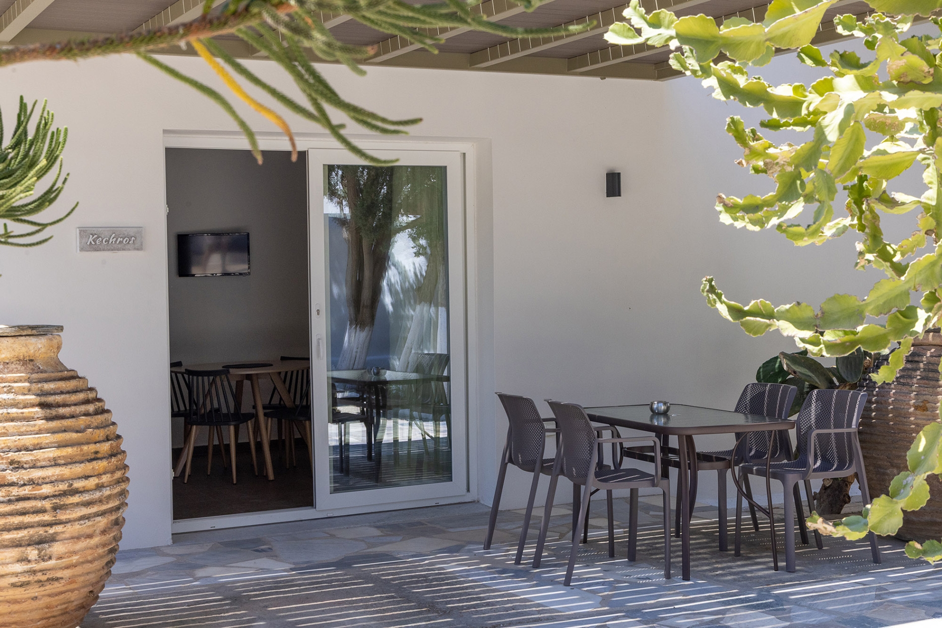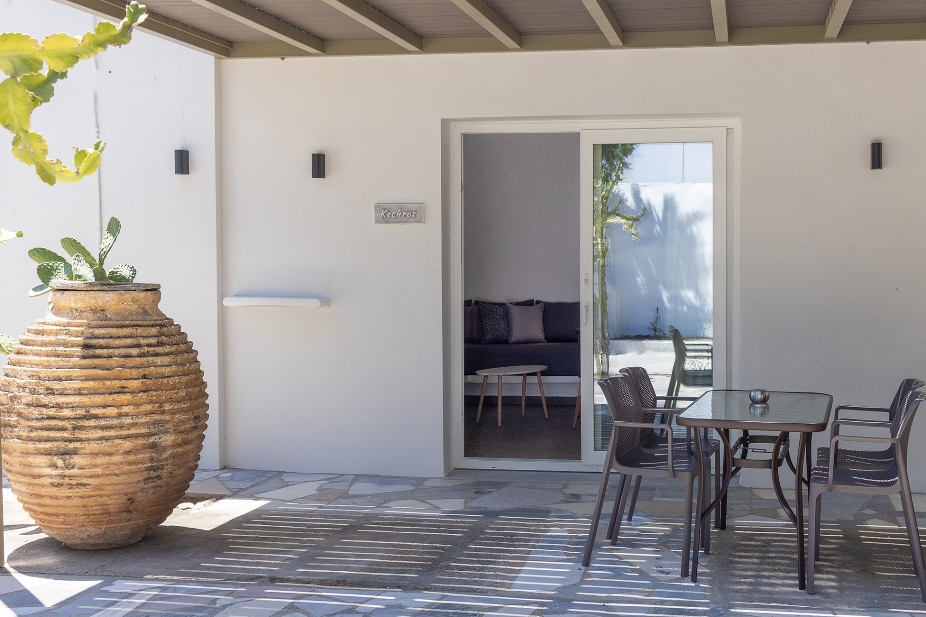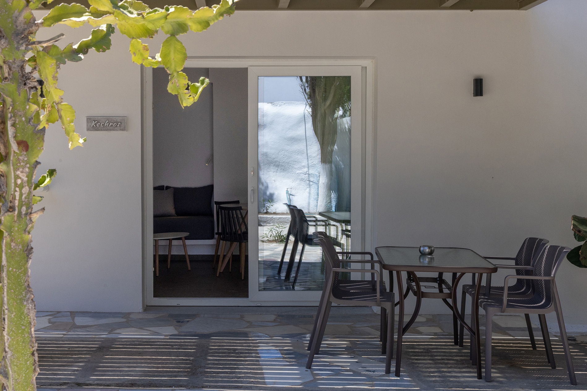 Named after the quaint village of Kechros, a small and picturesque settlement built on the Livaderi plateau near Steni and nestled on the slopes of Kechrovouni, the apartment reflects the natural beauty and traditional spiritual character of the area. Designed with classic Cycladic elements, including whitewashed walls, natural stone details, and traditional wooden accents, the apartment preserves the island’s heritage while offering modern comforts. Its garden oasis surrounds the property with greenery, flowering plants, and shaded spots, providing a serene setting for morning coffee, reading, or tranquil evenings immersed in nature.