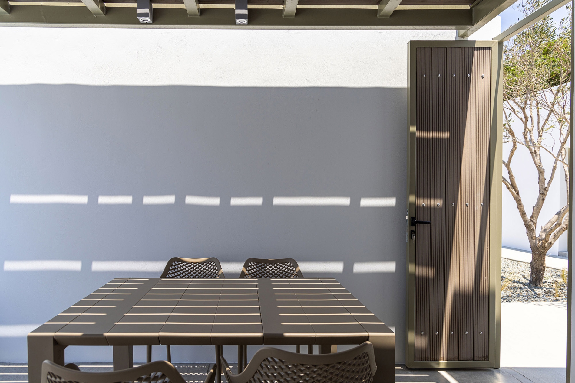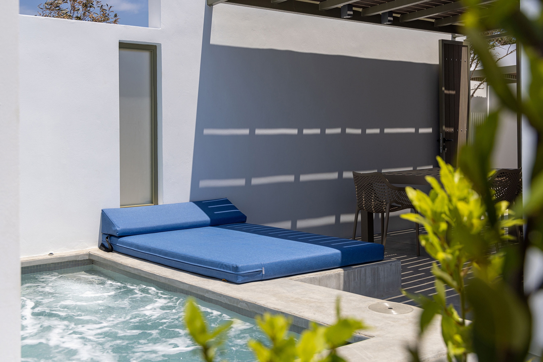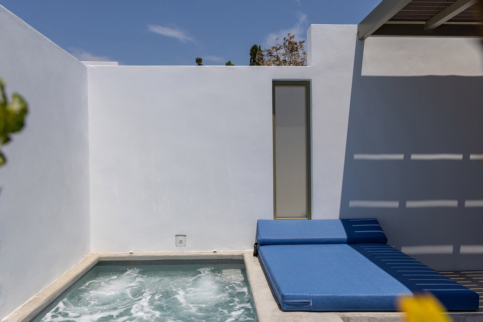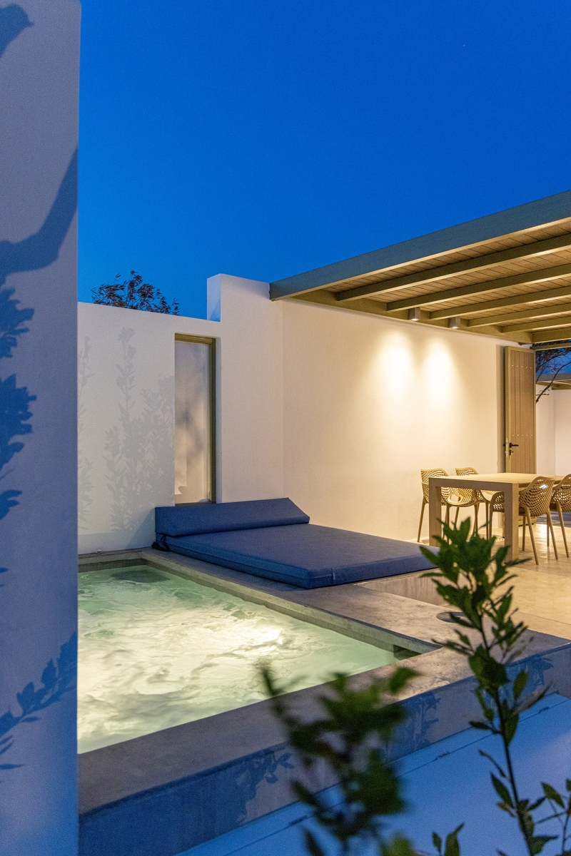 Spanning in an area of 41 sq.m., Agapi is ideal for families of four or groups of four people. It features a king size double bed with a high quality COCO-MAT mattress and two comfortable sofas that can accommodate two more people. It has a fully equipped kitchen, air conditioners and smart TVs in every room (living room and bedroom), and a bathroom with shower and marble sink. Outdoors guests enjoy a large outdoor heated jacuzzi, comfortable sun mattress and a lovely sitting area, ideal not only for deep relaxation but also for a modern work-ation, perfectly suited to digital nomads and remote professionals seeking productivity, focus, reliable connectivity, and a balanced work-life experience.