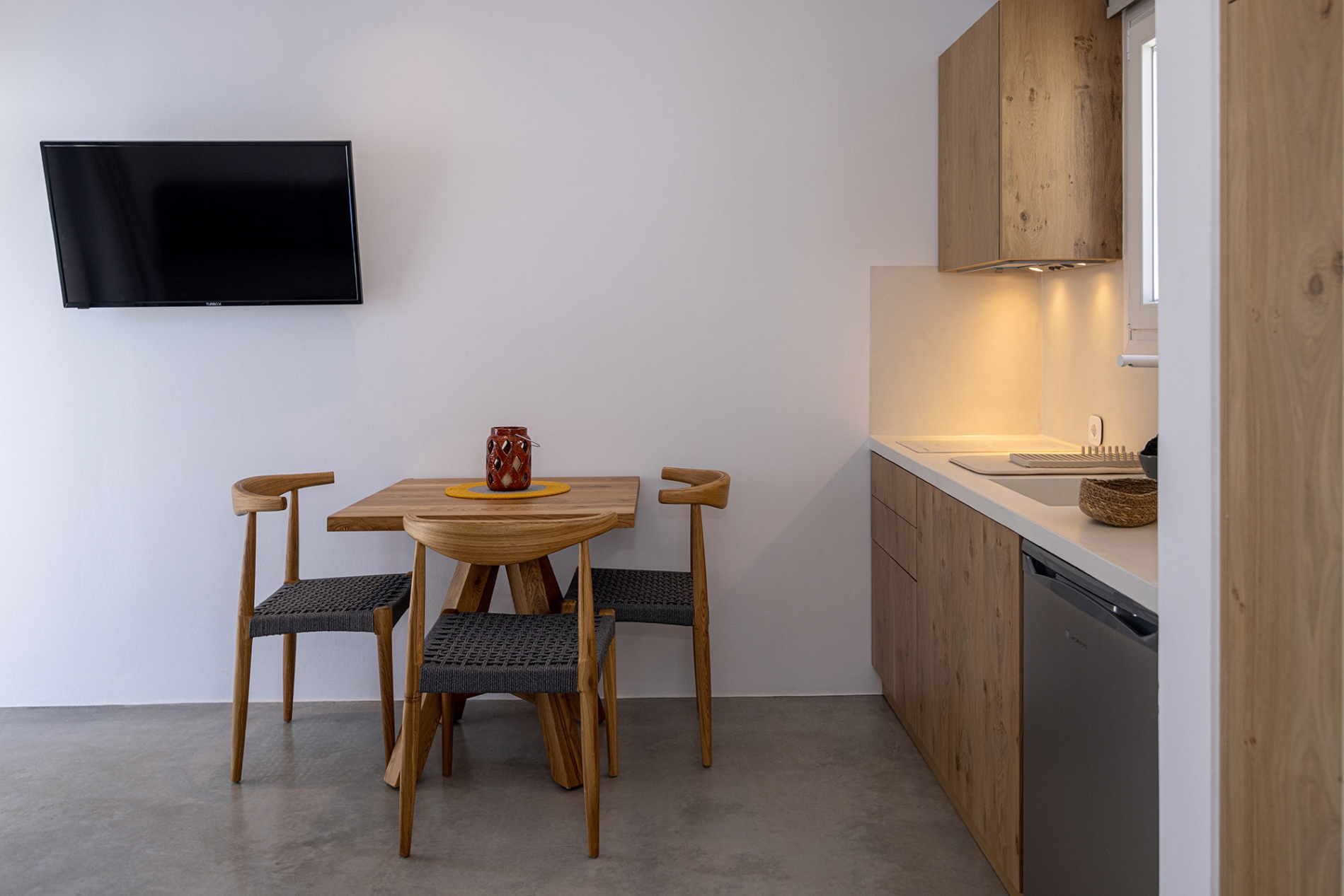 With a total area of 31 sq.m., the apartment is perfect for groups of up to three guests. It offers a king-size double bed with high-quality COCO-MAT mattress in the bedroom, as well as a comfortable sofa that can accommodate an additional guest in the living room. The apartment also includes a fully equipped kitchen, air conditioning and smart TVs in all rooms. The bathroom is fitted with a shower and an elegant marble sink. Outdoors, guests can enjoy a spacious heated jacuzzi, comfortable sun mattress, and a dedicated sitting area—an inspiring, tranquil setting ideal not only for deep relaxation but also for a modern work-ation, perfectly suited to digital nomads and remote professionals seeking seamless work-life balance, productivity, and slow-living by the Aegean.